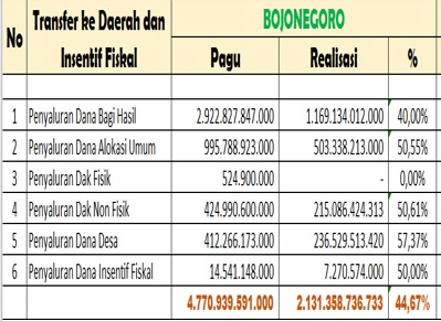 Kepala Kantor Pelayanan Perbendaharaan Negara (KPPN) Bojonegoro, Teguh Ratno Sukarno, dalam keterangannya menjelaskan bahwa alokasi terbesar berasal dari Dana Bagi Hasil (DBH), yakni sebesar Rp1,16 triliun dari total target Rp2,92 triliun atau setara dengan 40 persen realisasi.
