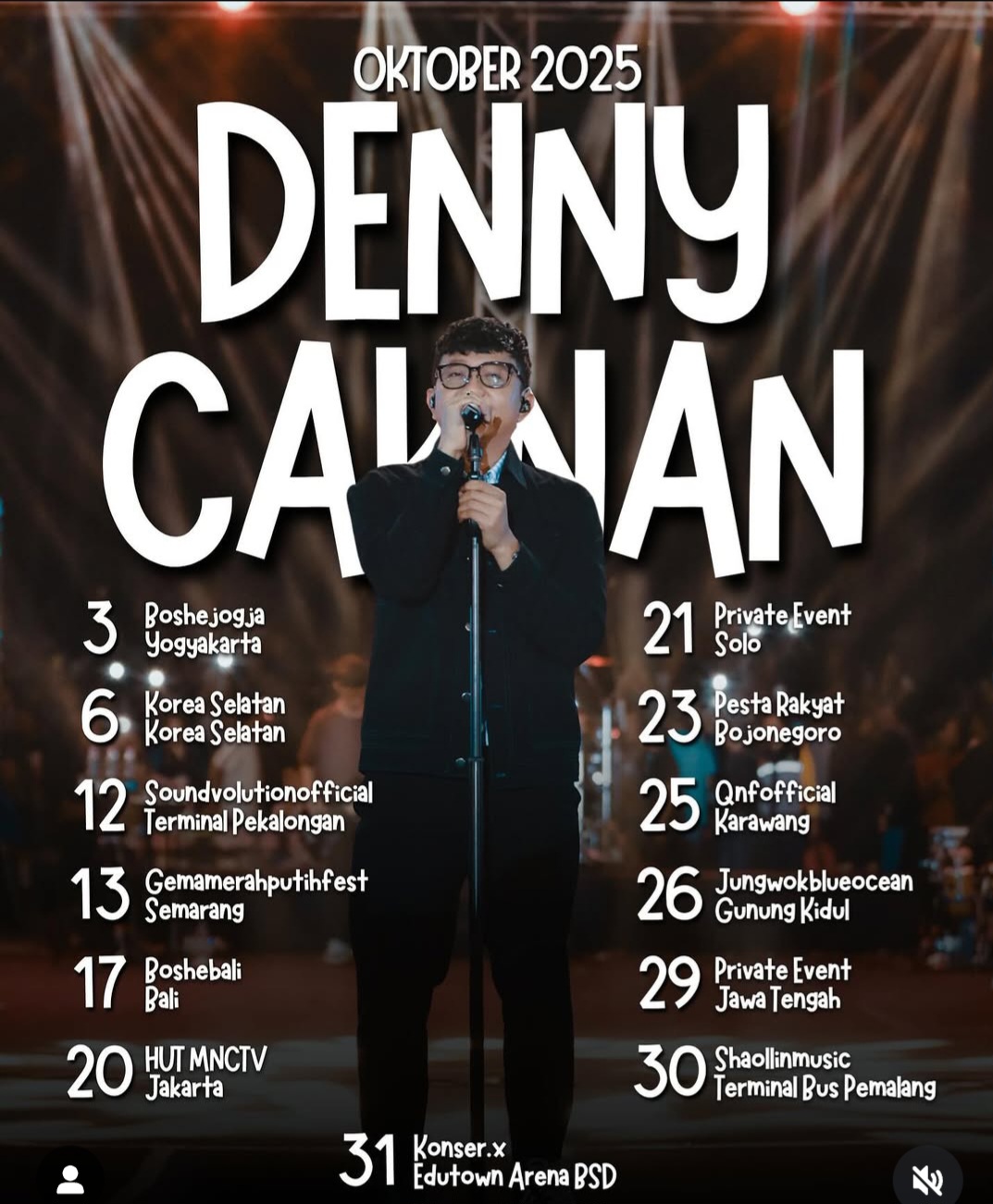 Sepanjang Oktober 2025, Denny Caknan akan tampil di 13 kota di berbagai daerah Indonesia. Salah satu kota yang masuk dalam jadwal konser tersebut adalah Kabupaten Bojonegoro, Jawa Timur.
