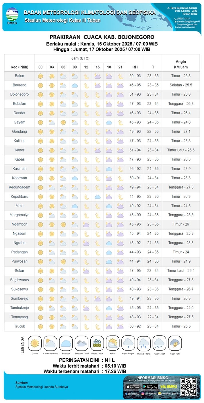 BOJONEGORO, iNewsBojonegoro.id - Badan Meteorologi, Klimatologi, dan Geofisika (BMKG) memprakirakan cuaca di Kabupaten Bojonegoro pada kamis, 16 Oktober 2025, akan didominasi kondisi cerah hingga berawan di sebagian besar wilayah.