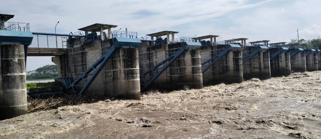 Pantauan di pintu air Bendung Gerak Bojonegoro, tepatnya di Desa Ngringinrejo, Kecamatan Kalitidu, menunjukkan arus air cukup deras dengan permukaan yang lebih tinggi dari biasanya.