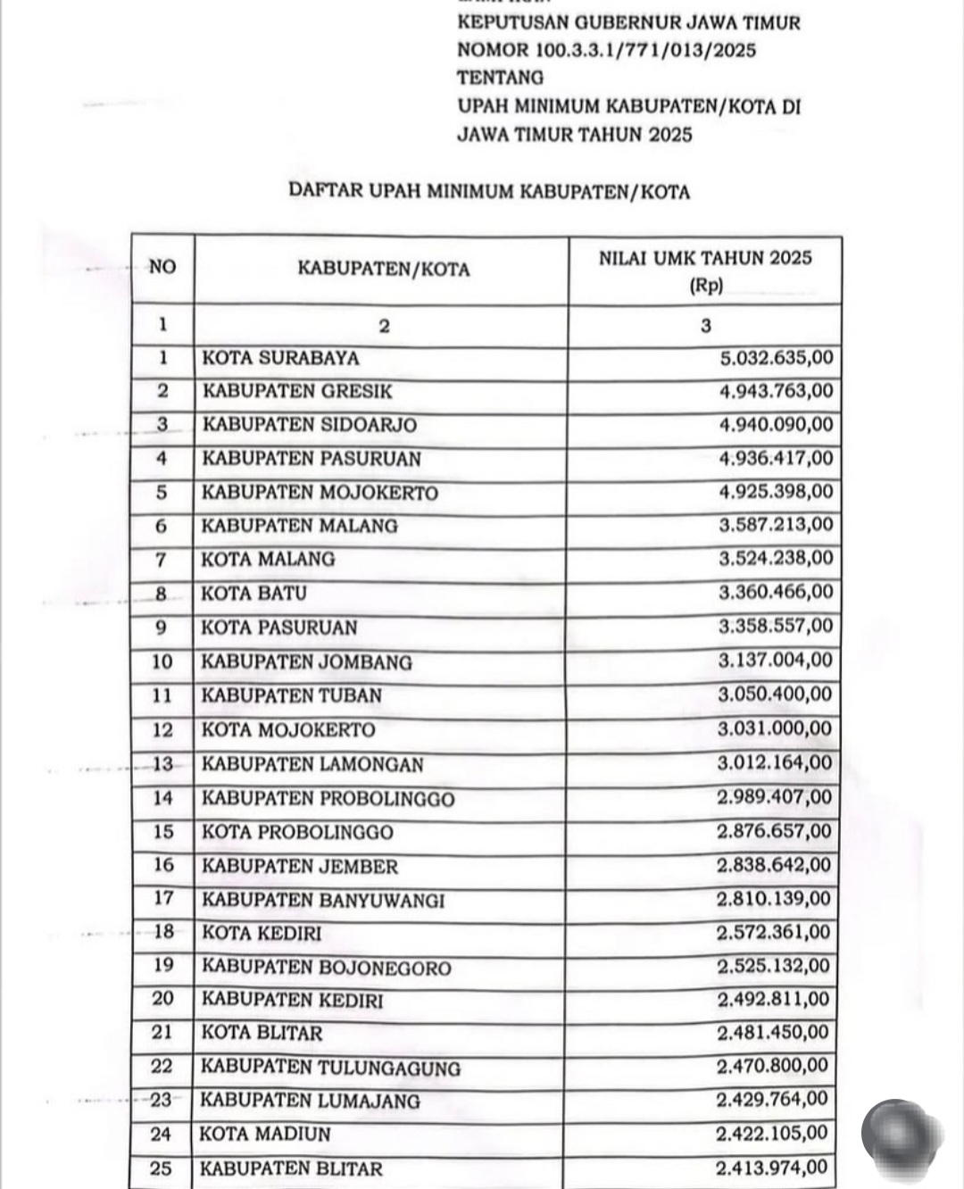 Kenaikan ini ditetapkan melalui Keputusan Gubernur Jawa Timur Nomor 100.3.3.1/771/013/2025 tentang Upah Minimum Kabupaten/Kota di Jawa Timur Tahun 2025.