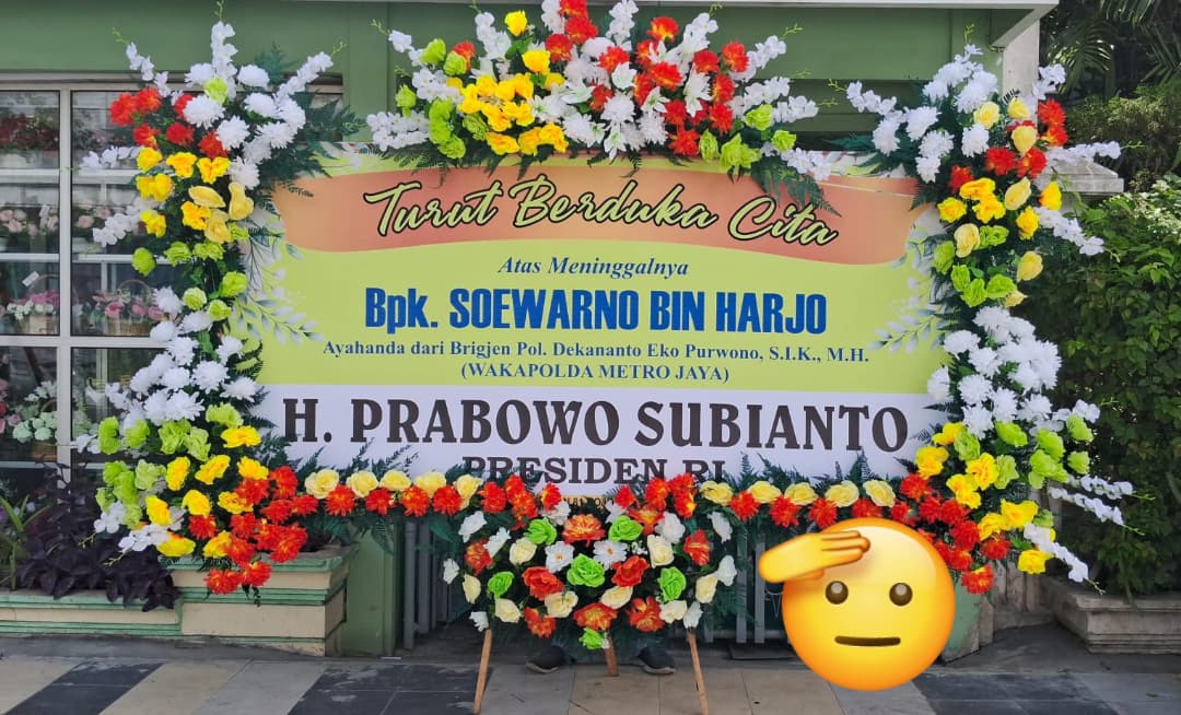 Salah satu karangan bunga datang dari Presiden Prabowo Subianto. Dalam pesannya tertulis, “Turut berduka cita atas meninggalnya Bapak Soewarno bin Harjo, ayahanda dari Brigjen Pol Dekananto Eko Purwono (Wakapolda Metro Jaya).”